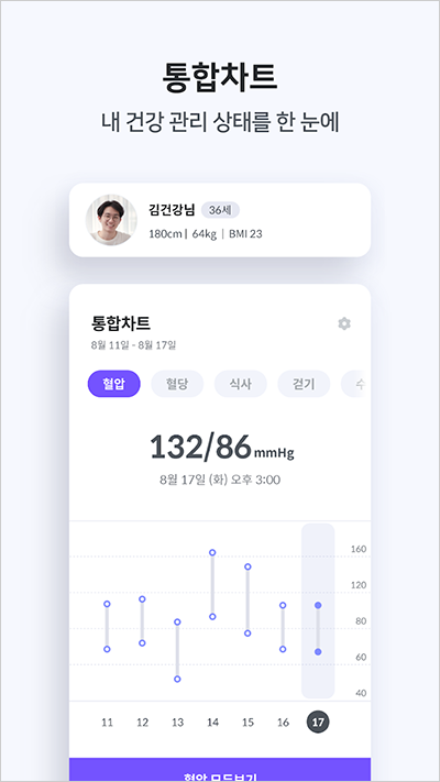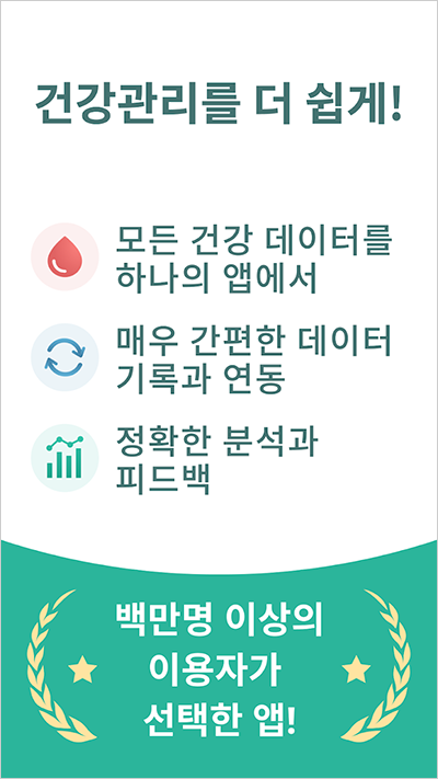 - 통합차트 : 앱에 기록된 건강 데이터를 한눈에 보고, 원하는 데이터만 따로 모아서 볼 수 있습니다.