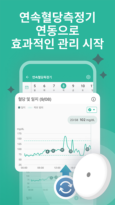 - 연속혈당측정기 연동: 혈당 변동 원인 분석, 식사·약물·운동이 혈당에 미치는 영향 확인.