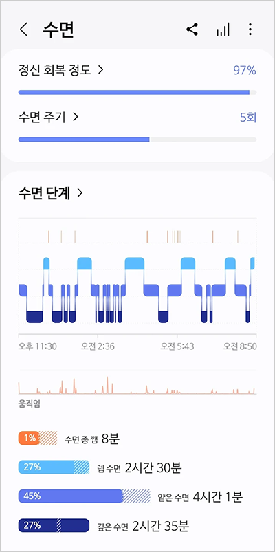 - 수면 패턴 모니터링: 갤럭시 워치로 수면 단계 및 점수 분석, 수면 질 개선 및 상쾌한 아침 맞이.