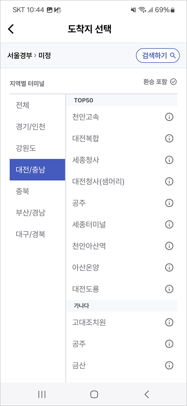 ⇨ 바로 도착지와 도착 터미널을 선택합니다.