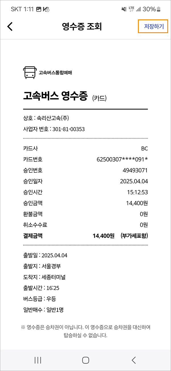 ⇨ 우측 상단의 [저장하기]를 클릭하면 갤러리에 영수증 화면이 저장됩니다.