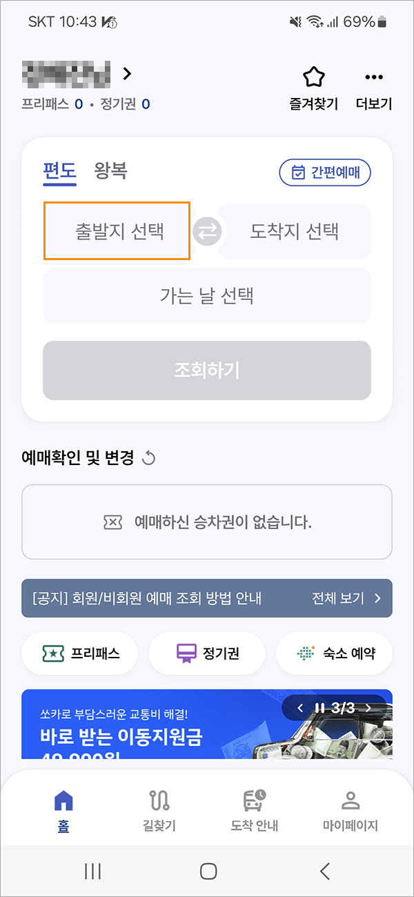 ⇨ 홈 화면에서 [출발지 선택]을 클릭합니다.