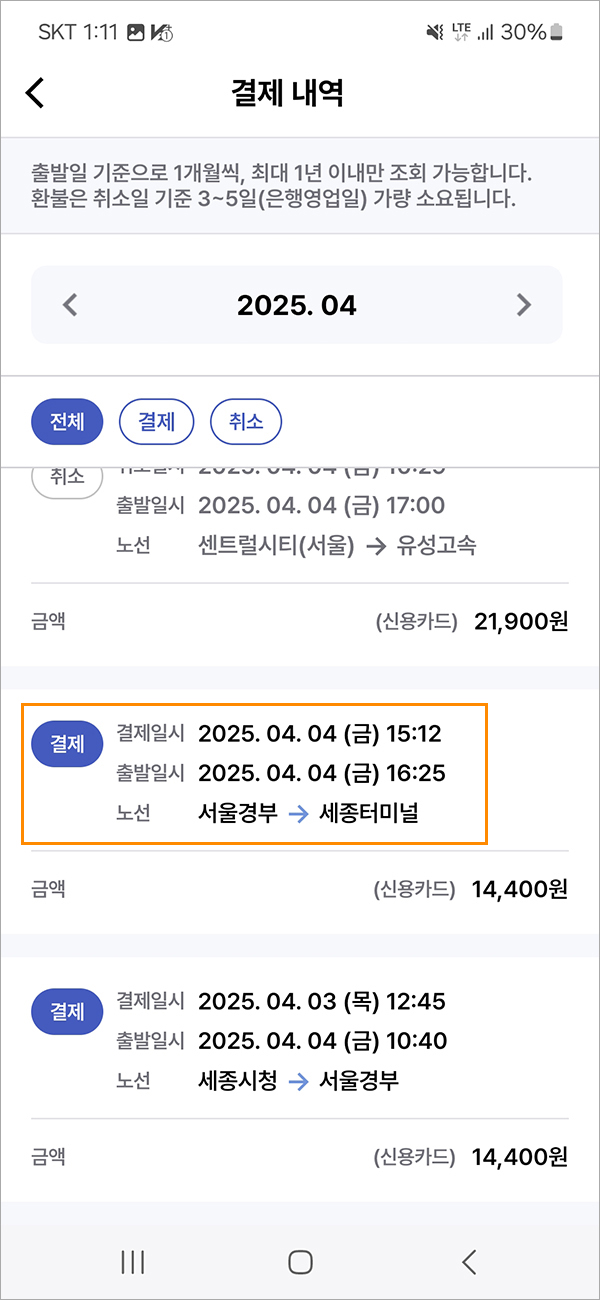 ⇨ 결제 내역을 클릭하면 검표 완료된 버스 승차 리스트가 나타납니다.