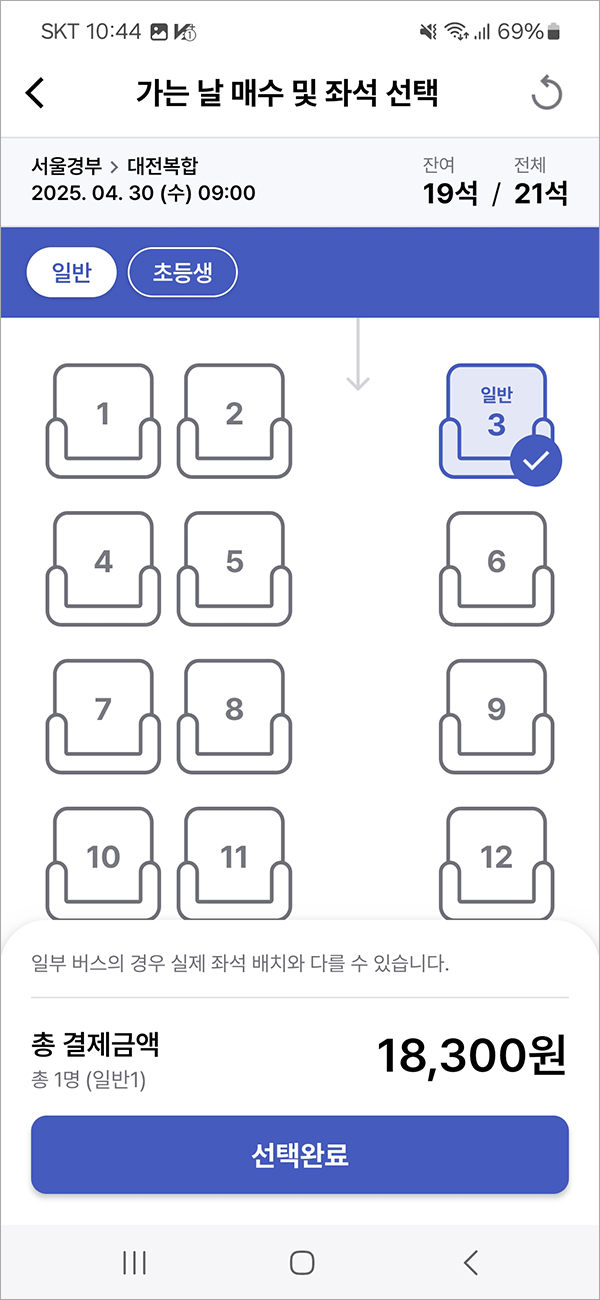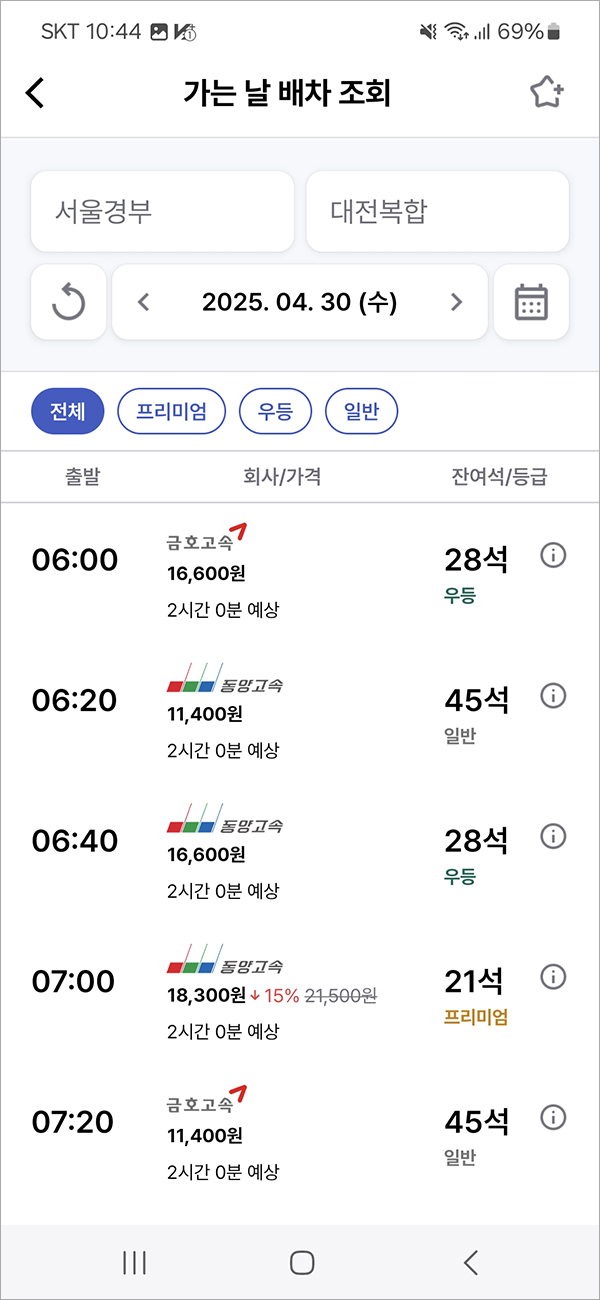 ⇨ 가는 날의 배차조회 화면에서 [버스 시간 및 잔여석/등급]이 표시됩니다.