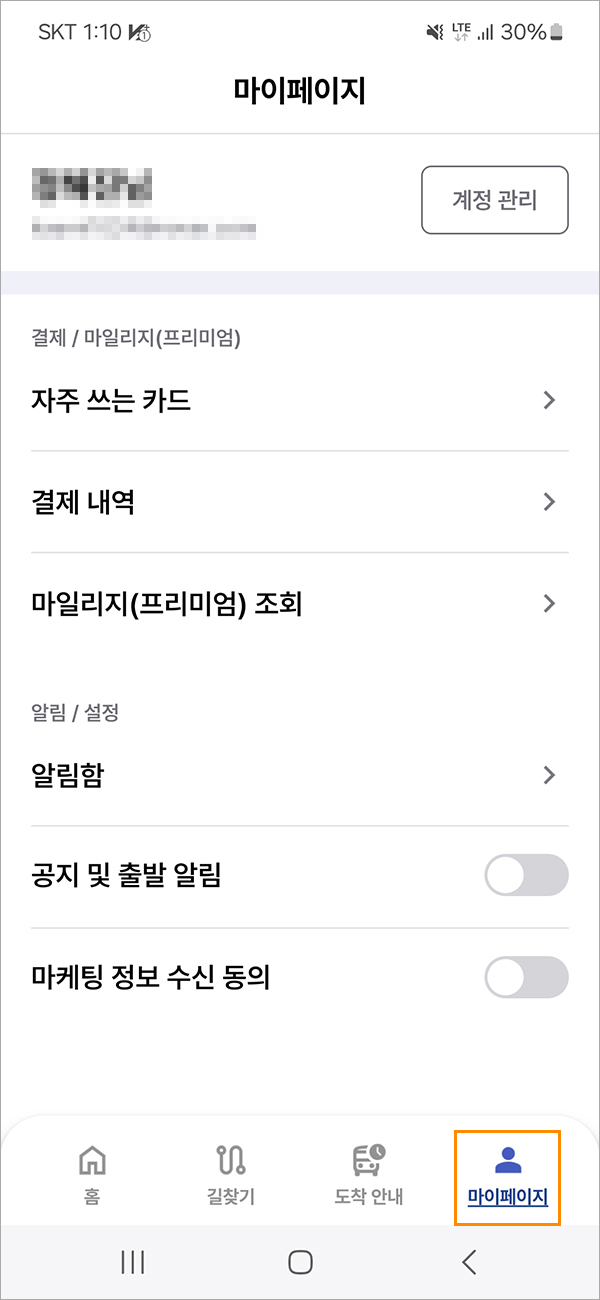⇨ "고속버스티머니" 앱 하단의 마이페이지를 클릭합니다.