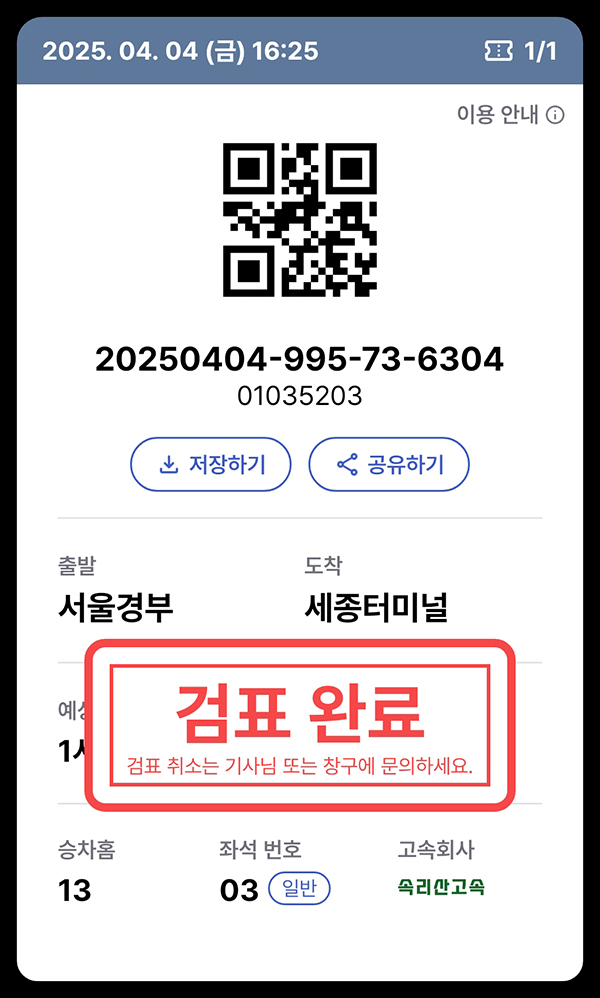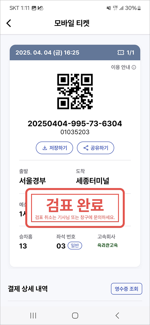 ⇨ 버스 승차시 QR 태그를 찍으면 발급한 티켓에 [검표완료] 스탬프가 찍히게 됩니다.