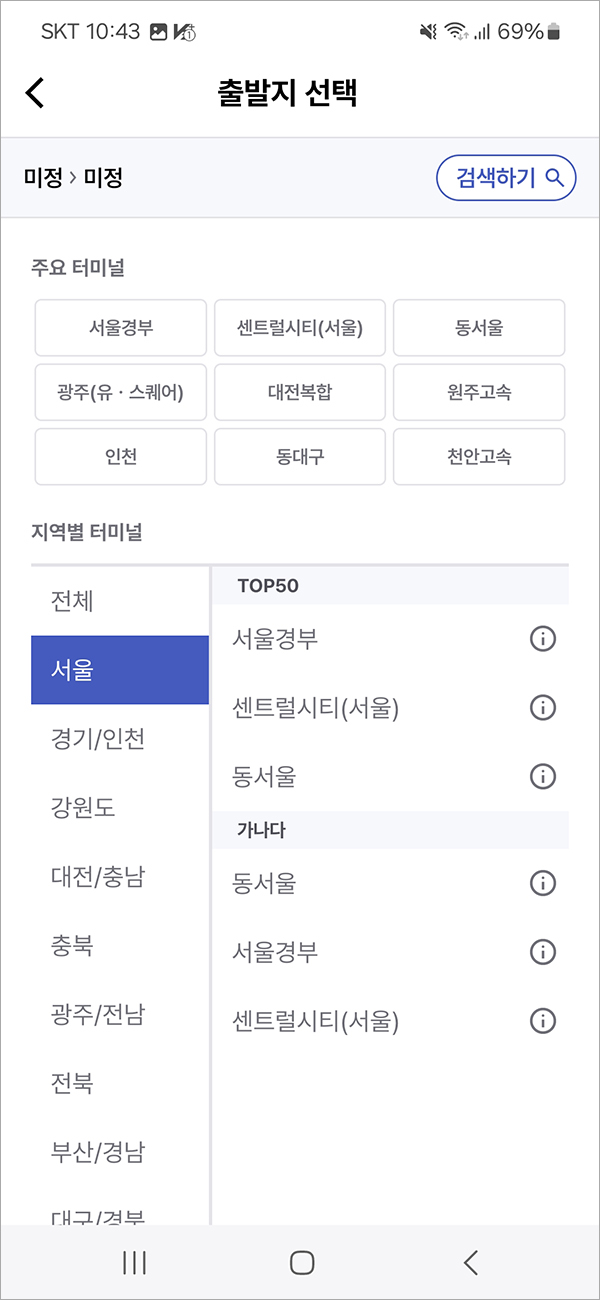 ⇨ 출발지를 선택하면 해당 지역 터미널이 나오며 출발지 터미널을 선택합니다.