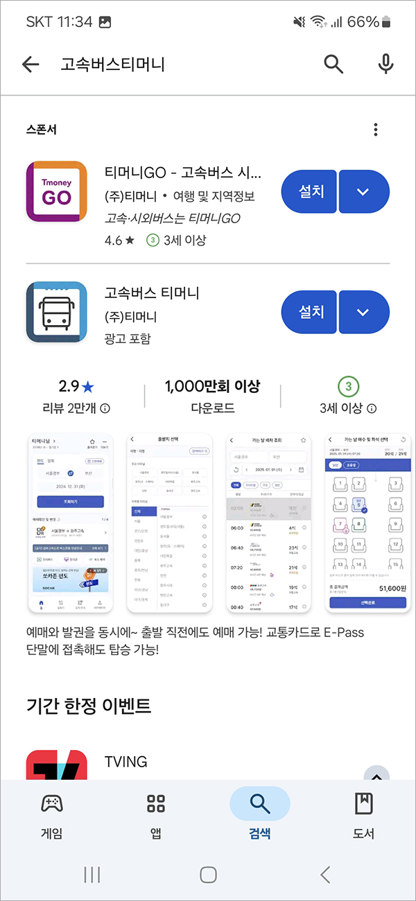 ⇨ 먼저 구글플레이에서 "고속버스티머니"을 검색하여 설치 합니다.