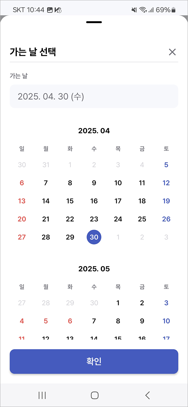 ⇨ 홈 화면에서 [가는 날 선택] 한을 클릭 후 날짜를 선택하고 [확인]을 클릭합니다.