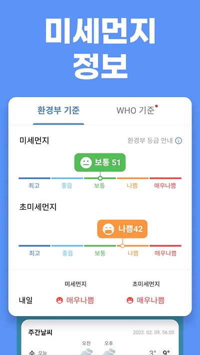 WHO와 국내 기준 중 선택 가능, - 눈/비, 미세먼지, 기상특보 알람 : 앱 실행 없이 눈, 비 소식, 대기 질 악화, 기상특보 발효 시 자동 알림