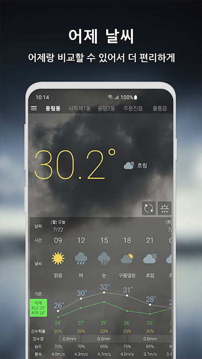 - 어제와 비교한 날씨 : "어제보다 ○○도 높아요/낮아요" – 첫화면 날씨만의 독특한 비교 기능!