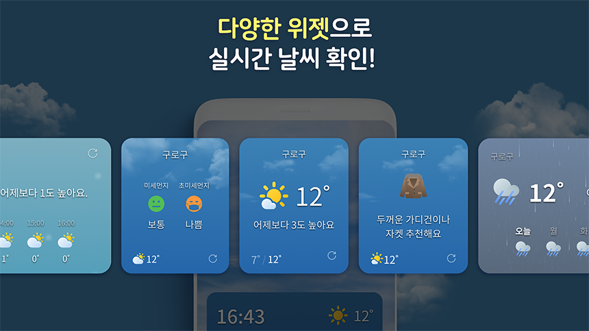 - 다양한 날씨 위젯 : 미세먼지, 기온별, 어제 비교, 시계 기능 등 다양한 위젯 제공.