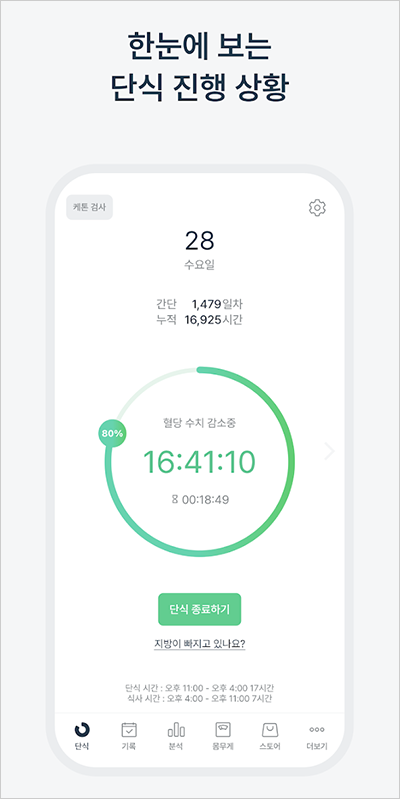- 단식 시간 기록 : 매일 단식 시간을 기록, 건강한 간헐적 단식 유지