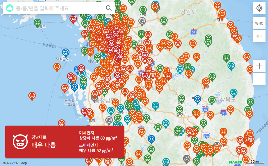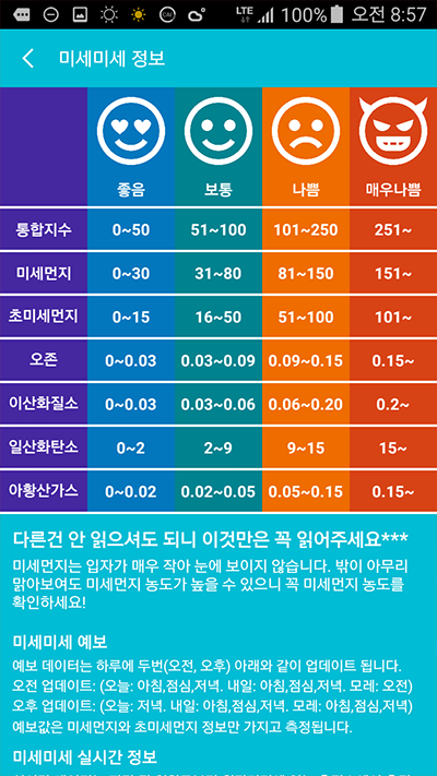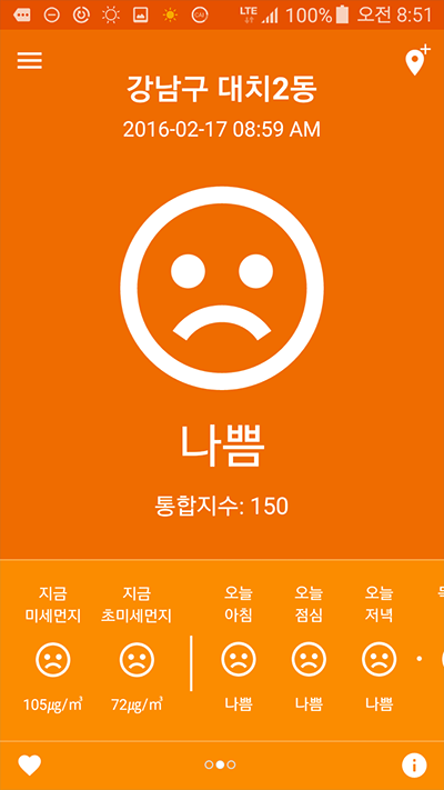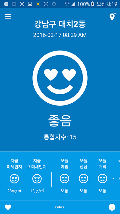 미세먼지가 좋을 때는 눈에 하트가 달린 아이콘이, 매우 나쁨일때는 화난 표정의 아이콘이 나타나 숫자를 보지 않더라도 빠르고 신속하게 미세먼지 수준을 확인할 수 있습니다.