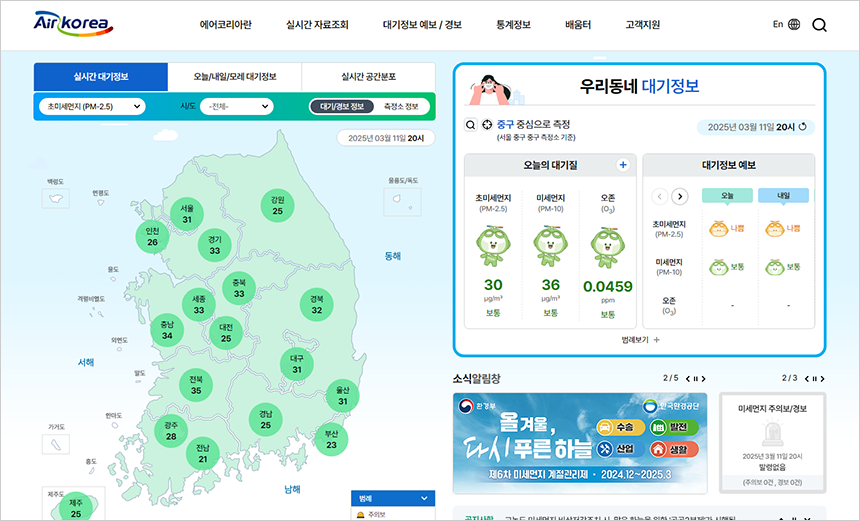 에어코리아는 웹사이트를 통해서도 실시간 대기 정보와 미세먼지, 초미세먼지 농도를 제공하고 있습니다.