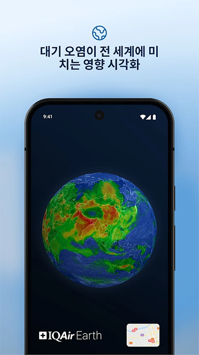 전 세계 실시간 공해 지수를 2D 파노라마 뷰와 히트맵 AirVisual Earth 3D 모델링으로 보여주고 있으며 즐겨찾는 위치에 대해 월간 및 48시간 내역과 현재 내가 있는 지역의 실시간 미세먼지 정보도 확인할 수 있습니다.