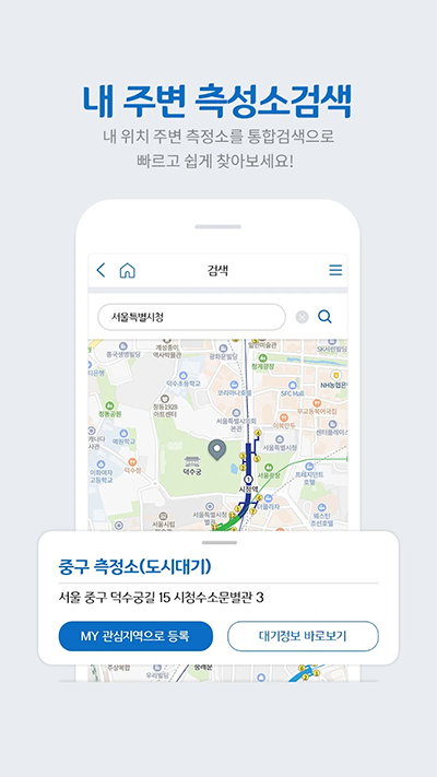 - 지역별 대기질 정보: 전국 400여 개의 측정소에서 실시간 대기질 정보를 제공, 사용자가 관심 있는 지역에 대한 정보를 쉽게 확인할 수 있도록 지원