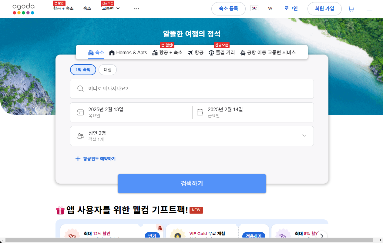 아고다는 전 세계 숙박 시설을 예약할 수 있는 인기 있는 온라인 플랫폼입니다. 다양한 호텔, 리조트, 아파트 등을 비교하고 예약할 수 있으며, 할인 혜택과 특가 상품을 제공해 여행객들에게 경제적인 선택을 돕습니다. 특히, 사용자 리뷰와 평점 시스템을 통해 신뢰할 수 있는 정보를 제공합니다.
