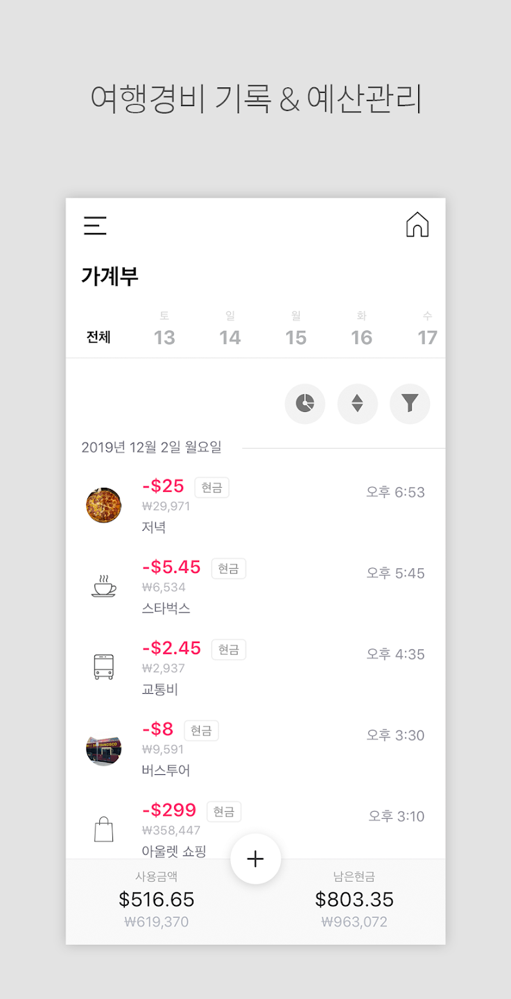 지금부터 여행 가계부 앱의 마법 같은 기능을 살펴볼까요?