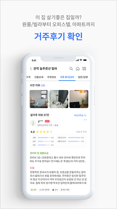 - 원룸, 빌라, 오피스텔, 아파트의 거주 리뷰 및 생생한 거주 후기 제공